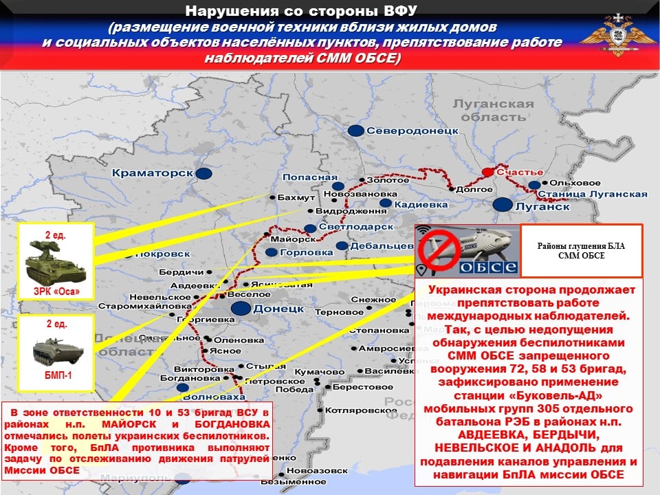 ♦️Украинская сторона продолжает препятствовать работе международных наблюдателей. Так, с целью недопущения обнаружения беспилотниками СММ ОБСЕ запрещенного вооружения 72, 58 и 53 бригад, зафиксировано применение станции «Буковель-АД» мобильных групп 305 отдельного батальона РЭБ в районах н.п. АВДЕЕВКА, БЕРДЫЧИ, НЕВЕЛЬСКОЕ И АНАДОЛЬ для подавления каналов управления и навигации БпЛА миссии ОБСЕ.
