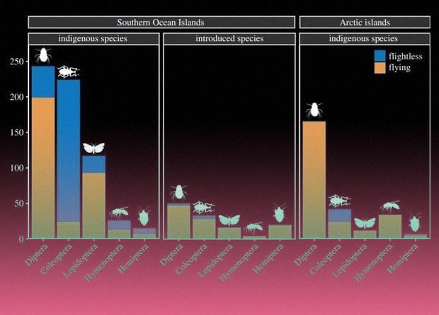 Подобно птицам, на изолированных островах многие насекомые теряют способность летать. Почему это происходит — не до конца ясно. Например, Чарльз Дарвин предполагал, что хорошо летающих насекомых просто сносит в море ветром, так что выживают лишь те, кто летает хуже. В результате вид постепенно становится бескрылым. Проанализировав данные о насекомых, обитающих на 28 островах Субантарктики и Антарктики, а также пяти островах Арктики, австралийские энтомологи подтвердили, что Дарвин был частично прав: сильные ветра действительно оказались важнейшим фактором, заставляющим островных насекомых отказываться от полета