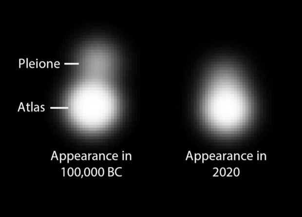 В 100000 году до нашей эры человеческий глаз мог различить на небе звезды Атлас и Плейону, благодаря чему в скоплении Плеяды были видны семь, а не шесть ярких звезд. Этот момент времени, по мнению ученых, можно считать отправной точкой возникновения легенд о скоплении, которые у народов в разных частях земного шара схожи