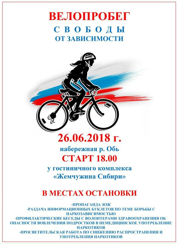 26 июня на набережной реки Обь пройдет "Велопробег свободы от зависимости", посвященный Всемирному дню борьбы против наркомании.