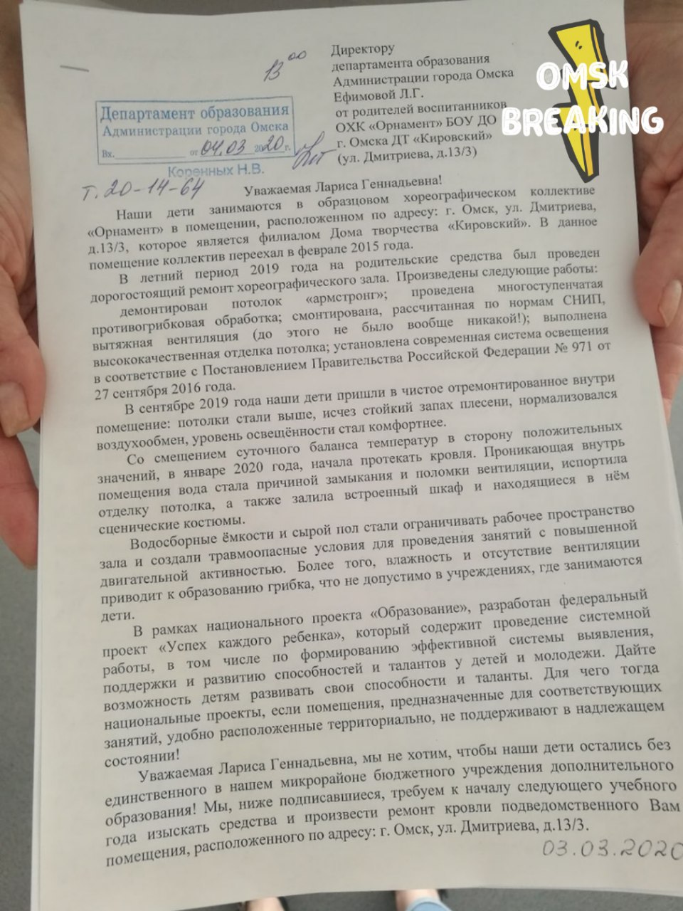 В депобре в ответ на письмо заявили, что деньги на ремонт кровли в здании хореографического коллектива на 2020 год не предусмотрены.