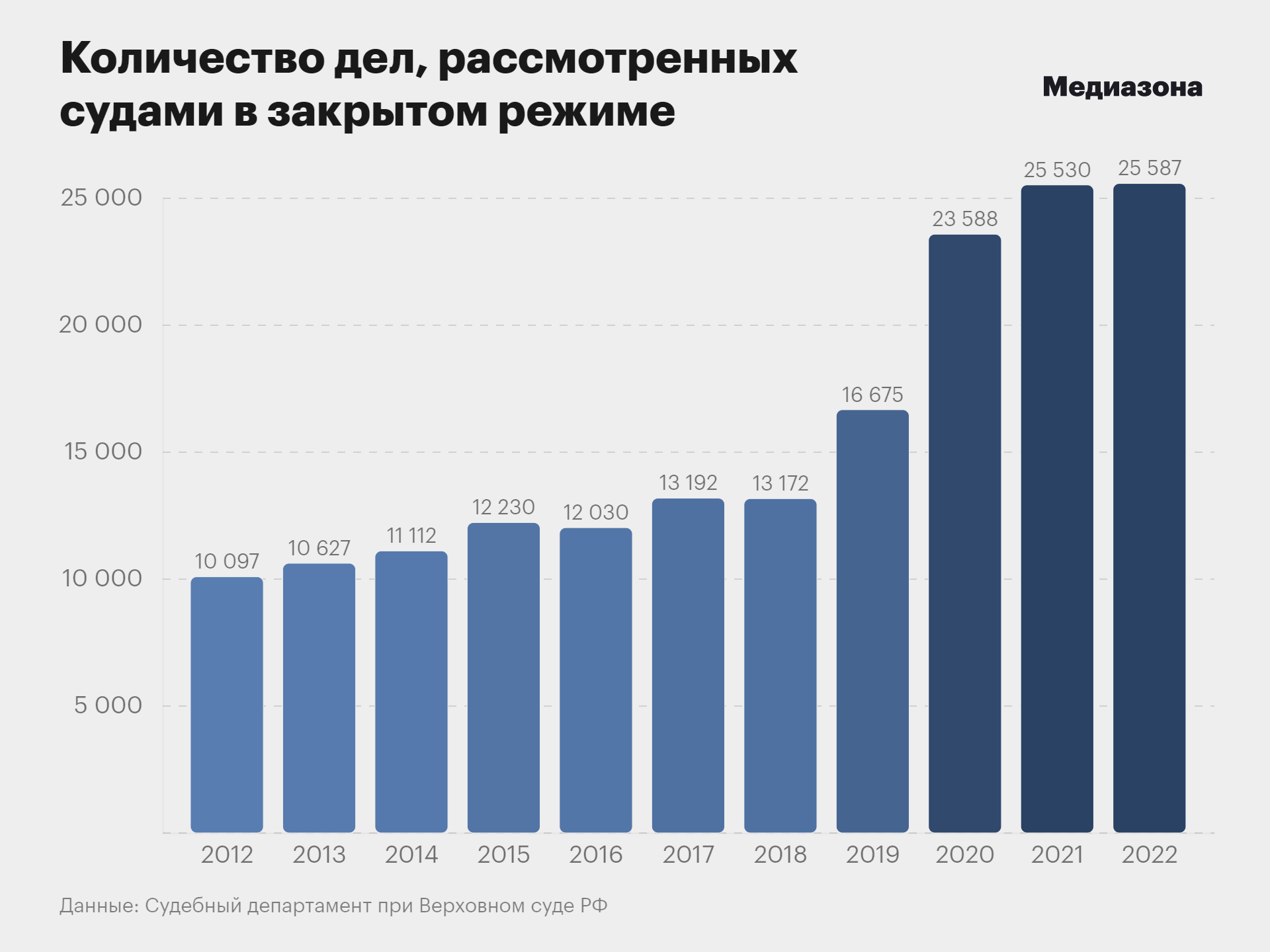 В 2022 году российские суды установили рекорд по количеству уголовных дел, рассмотрение которых прошло в закрытом режиме — без слушателей и журналистов. Об этом свидетельствуют данные судебной статистики, которые изучила «Медиазона».