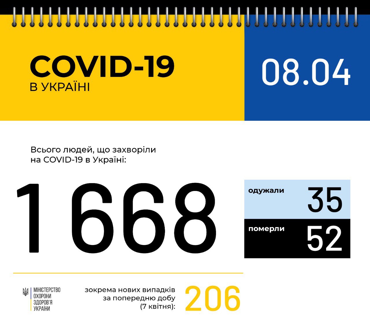 За даними ЦГЗ, станом на 9:00 8 квітня в Україні 1668 лабораторно підтверджених випадків COVID-19, з них 52 летальні, 35 пацієнтів одужало. За добу було зафіксовано 206 нових випадків.