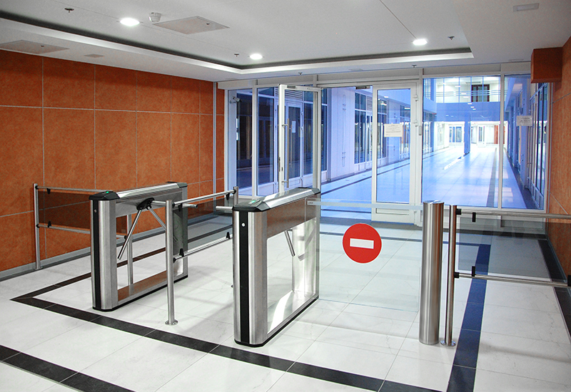 Скоростные проходы обладают высокой пропускной способностью – 60 человек в минуту, что позволяет предотвратить образование очередей при входе в бизнес-центр. Автоматическая калитка обеспечивает комфортный доступ маломобильного населения и дополнительный эвакуационный выход. Для сбора карт доступа посетителей применяется картоприемник.