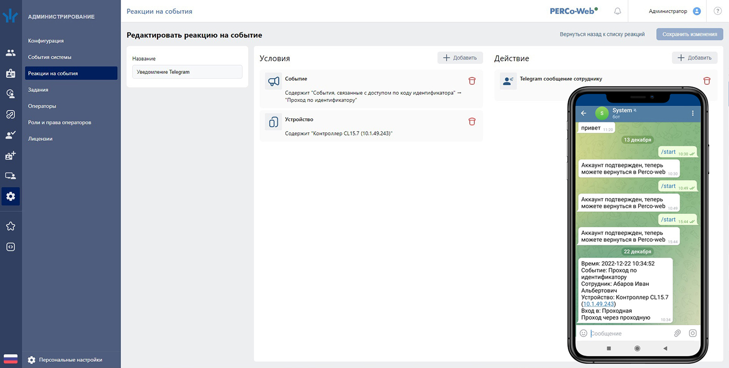 – рассылка уведомлений о событиях системы посредством Telegram