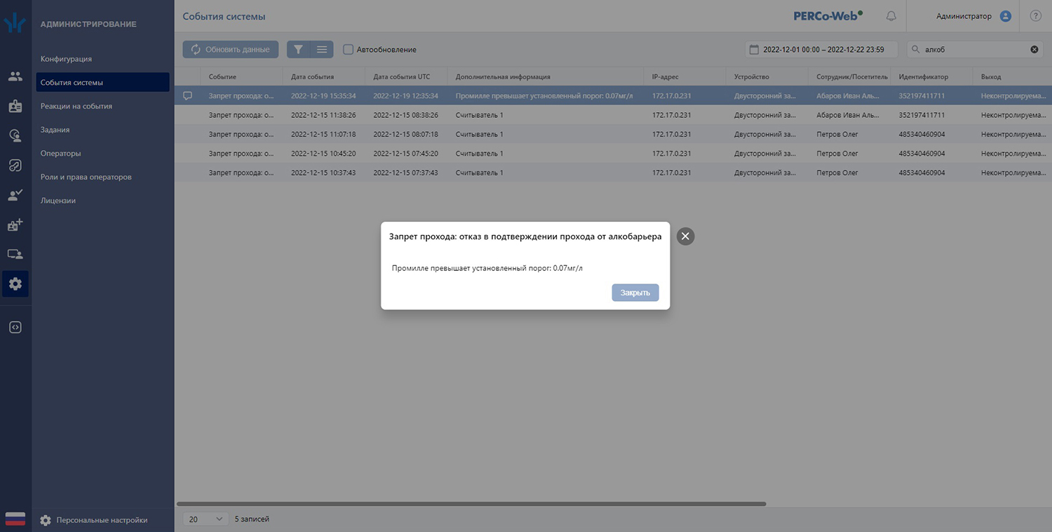 В системе PERCo-Web реализована полноценная интеграция с алкотестером "Алкобарьер". Система в онлайн режиме оповещает службу безопасности посредством мессенджера или электронной почты о положительных результатах на алкоголь, что позволяет оперативно реагировать на инциденты и вовремя проводить освидетельствование.