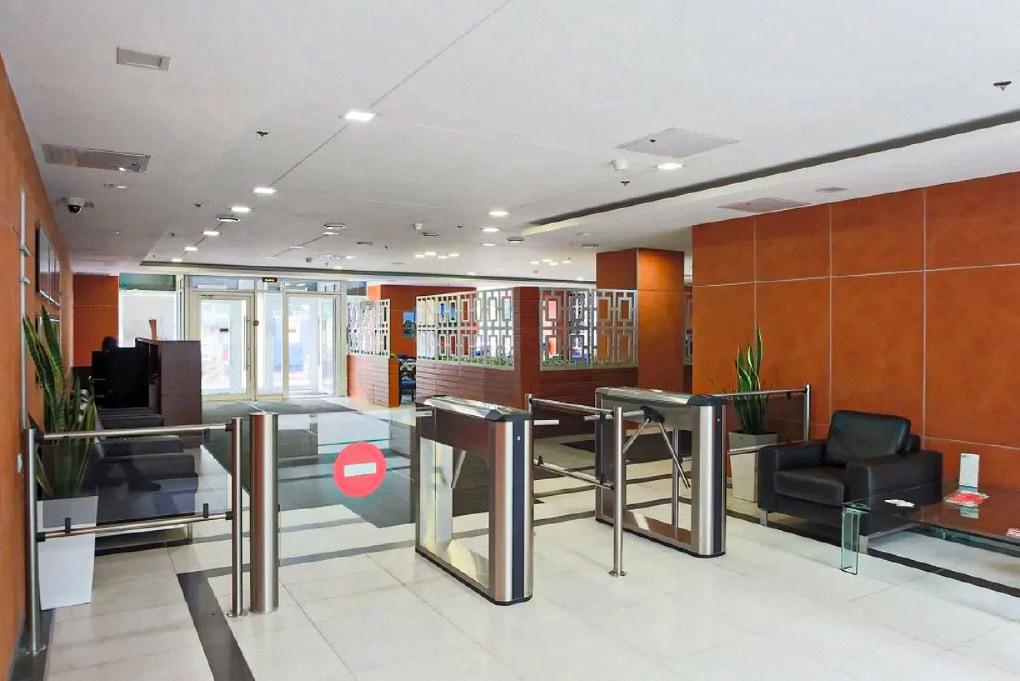 Входы в здание оборудованы тумбовыми турникетами TBC01.1A со встроенными считывателями и картоприемниками, а также автоматическими калитками WMD-06.
