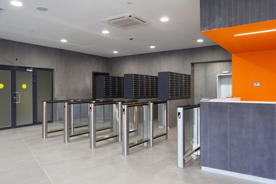 Входы в подъезды ЖК оборудуются турникетами и считывателями. Для сохранения эстетичного вида входной группы считыватели могут быть встроены в турникет. Работой турникетов управляют контроллеры. Оптимальным решением станут скоростные проходы – турникеты с распашными или раздвижными створками. Анализ нахождения людей в контролируемой зоне осуществляют оптические датчики, предотвращающие одновременный проход нескольких человек, возможный при использовании домофона. При возникновении экстренной ситуации или пропадании электропитания створки скоростных проходов открываются автоматически, позволяя организовать быструю эвакуацию людей. Вход в зону хранения колясок и велосипедов можно оборудовать калитками, позволяющими организовать провоз габаритных предметов.