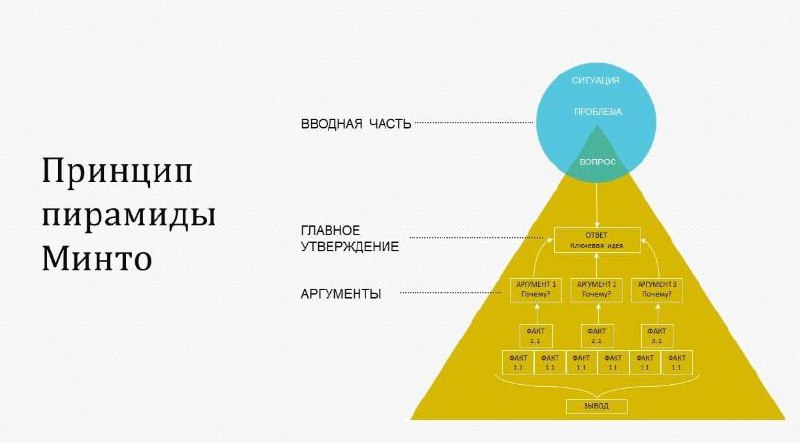Основное правило этой пирамиды: самую важную мысль выносим в начало текста/разговора, а дальше шаг за шагом накидываем аргументы, которые главную мысль подтверждают.