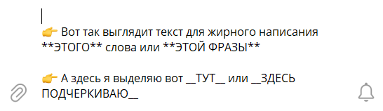 👉 Курсивный текст – поставить два нижних подчеркивания (__) в начале слова и после него.