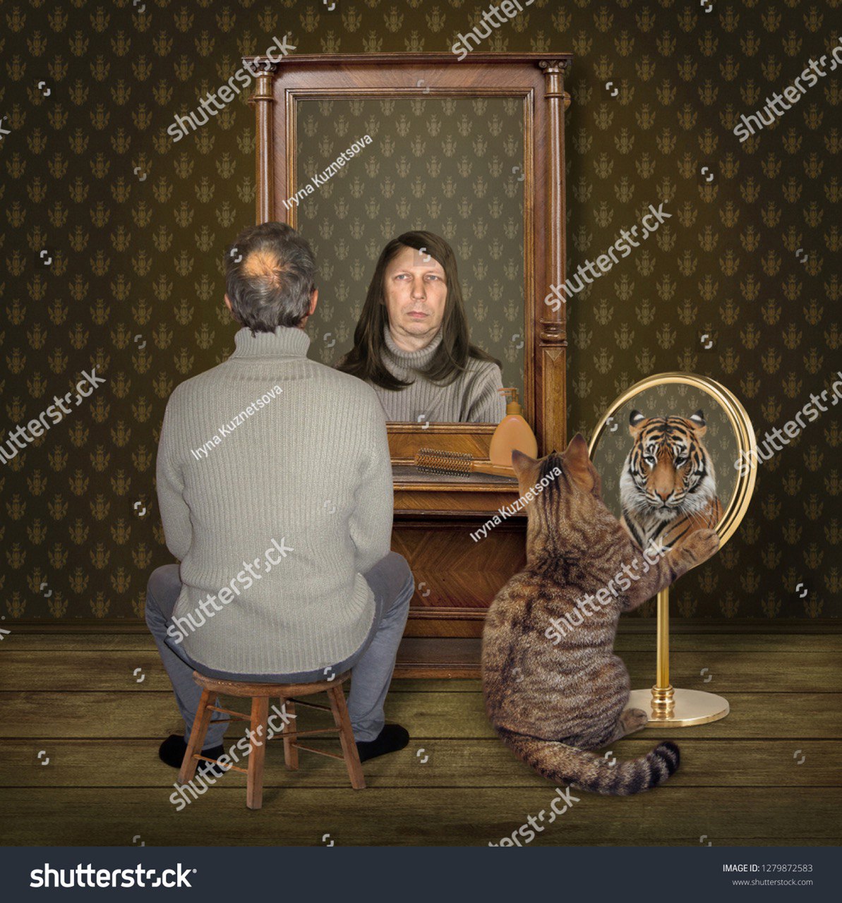 Искали картинку кота, который смотрит в зеркало и видит там льва или тигра. Что-то на тему синдрома самозванца, заниженной самооценки или про скрытый потенциал внутри человека. И вот какой шедевр появился в выдаче.