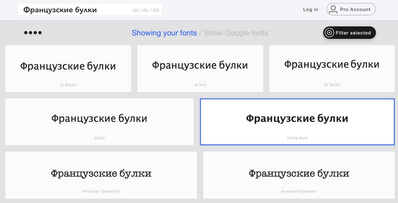 Отличный сервис, который показывает как выглядит ваш текст в разных шрифтах. Важно — показываются только установленные на вашем компьютере шрифты. Очень простой и удобный. Можно собирать коллекции, менять масштаб и много другого полезного. Частенько пользуюсь, чтобы быстренько посмотреть как лучше будет выглядеть заголовок, например.