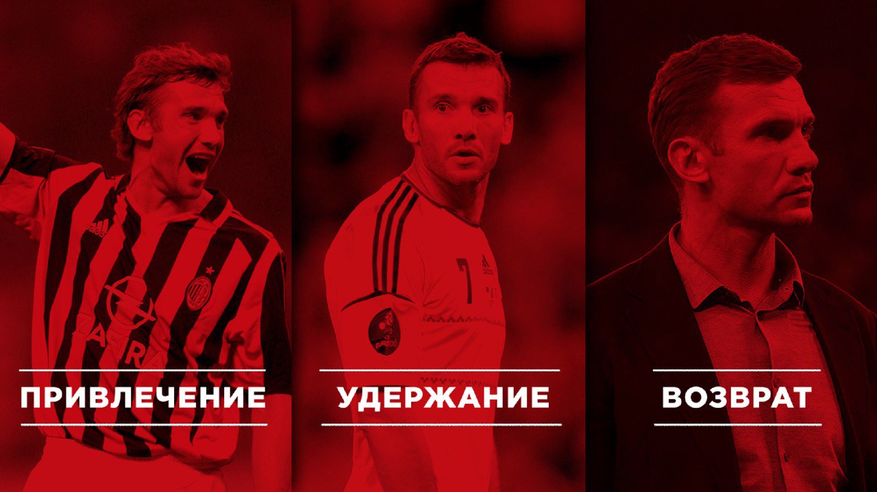 Обсудили и утвердили футбольную тематику презентации — я приступил к оформлению. Красный цвет — фирменный у компании. И вот на этом слайде нужно было показать, а голосом рассказать про разные этапы: привлечение, удержание и возврат. Я решил завернуть эти этапы в разные роли игровой карьеры Андрея Шевченко: