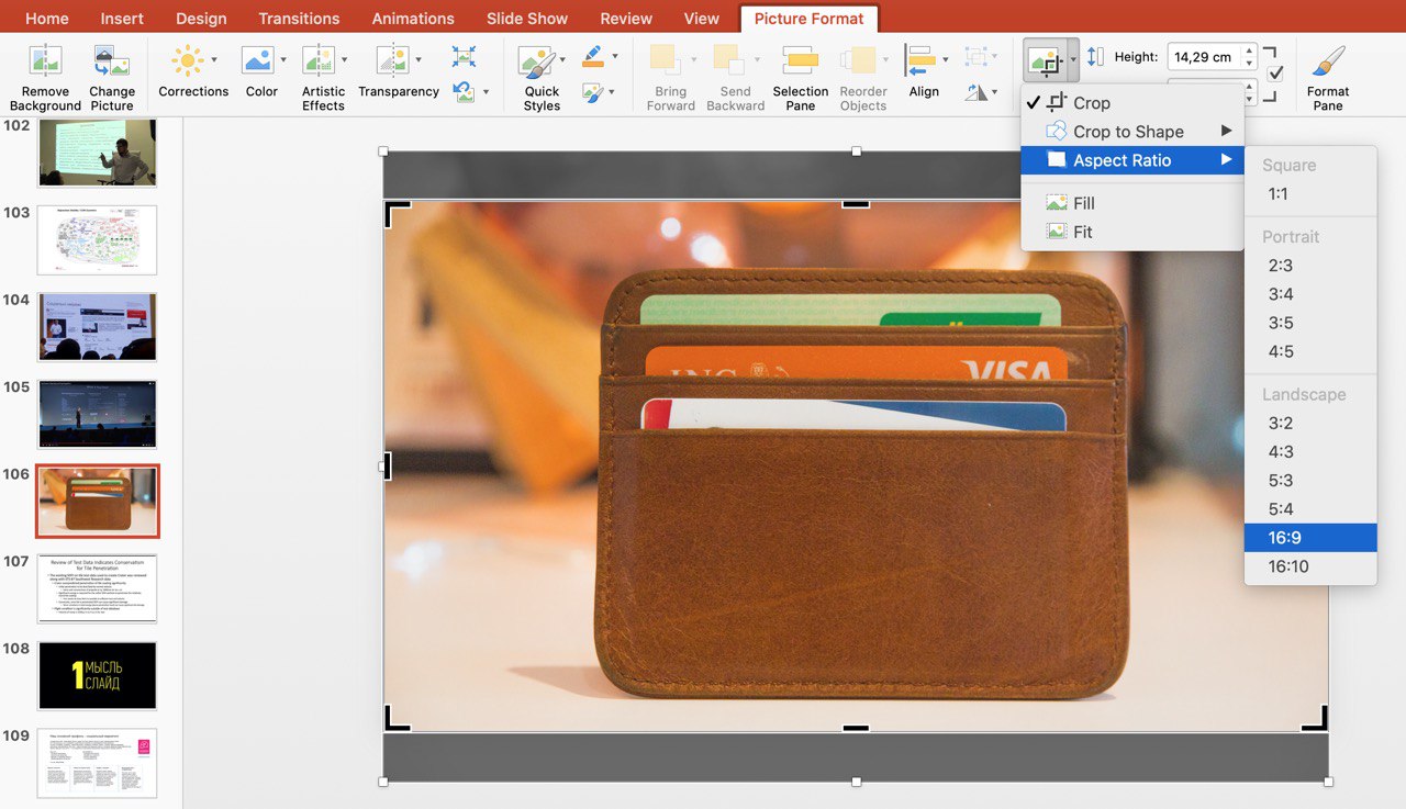 Если есть возможность сделать какое-либо действие меньшим количеством кликов, то я обязательно этим воспользуюсь. Например, обрезка фото. Чтобы не подгонять видимую зону изображения под границы слайда, можно просто обрезать его по пропорции 16:9. У Вас же слайды 16:9, а не 4:3;)