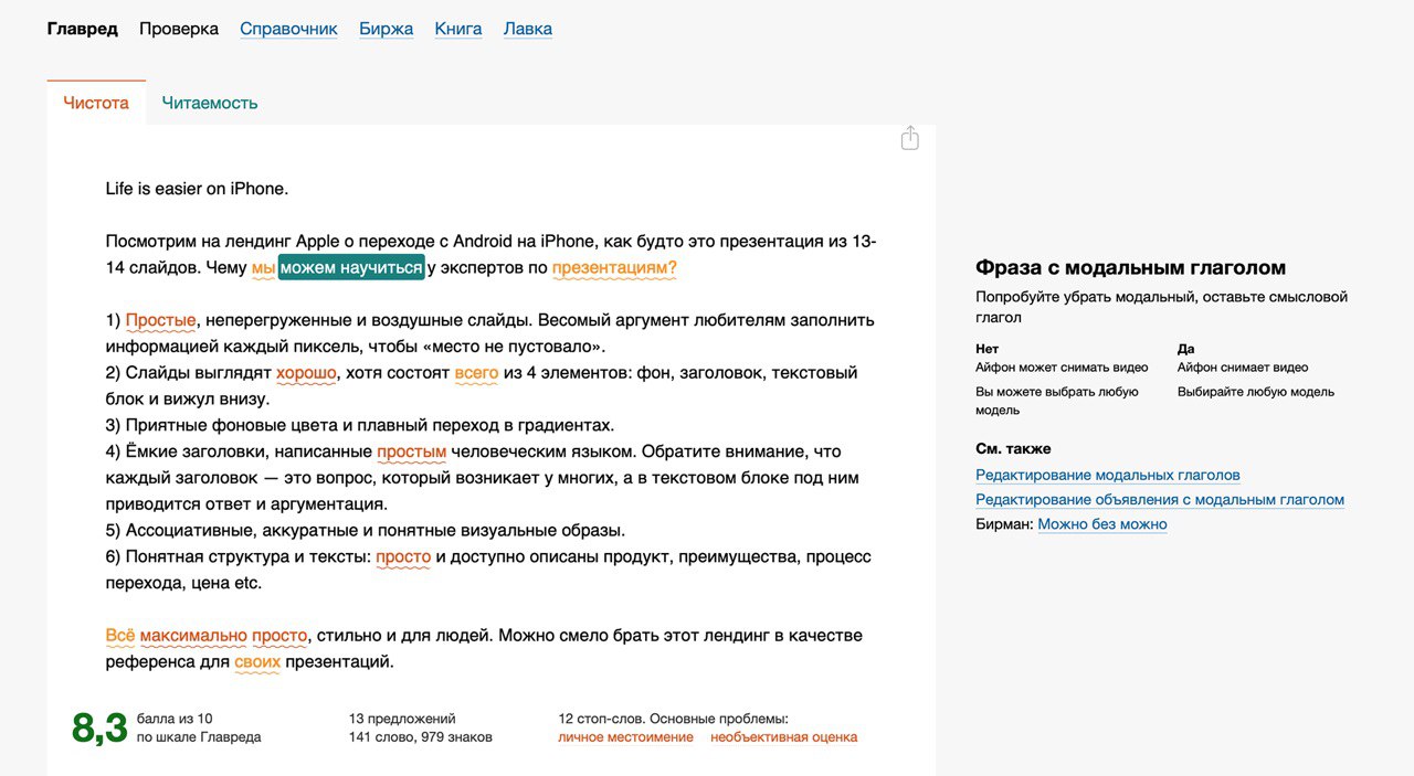 Главред — сервис Максима Ильяхова, который помогает очистить текст от словесного мусора и проверяет на соответствие информационному стилю.