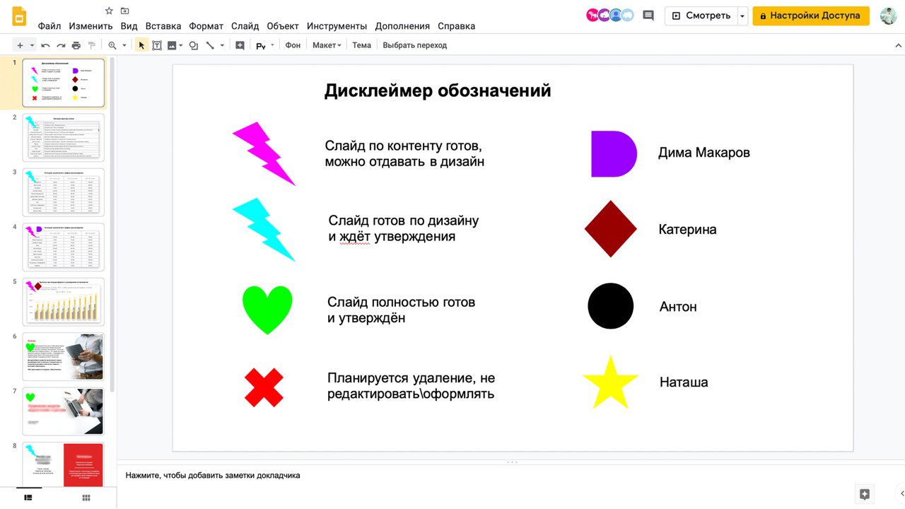 У каждого из участников есть «свои фигуры», чтобы всем было ясно кто конкретно ответственен за этот слайд. Фигуры и цвета можно выбирать любые — дело личное, главное, чтобы они отличались друг от друга.