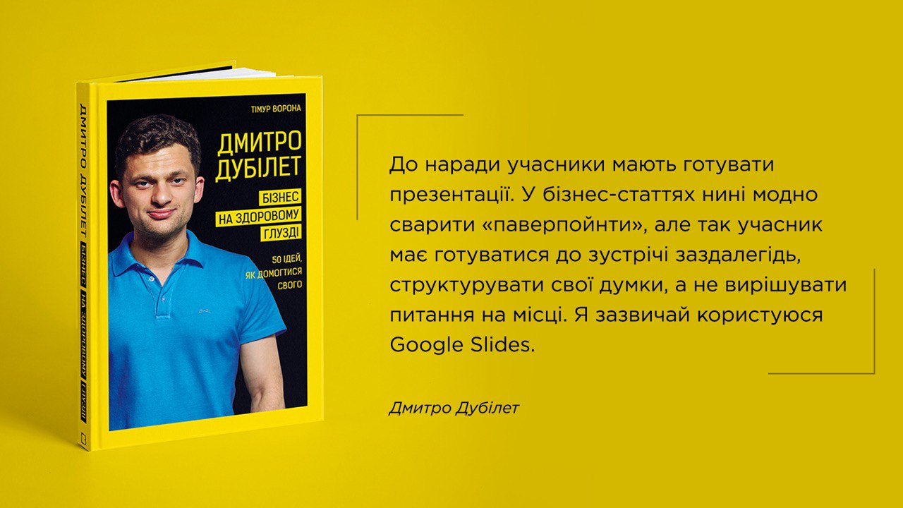«Бiзнес на здоровому глуздi» Дмитрия Дубилета — вторая книга, которую я начал читать за последние месяцы. И вот наткнулся на мнение автора, которое полностью поддерживаю и стараюсь мотивировать и прививать на своих обучениях: готовьтесь заранее, структурируйте свои мысли, не откладывайте на последнюю ночь, Гугл Презентации рулят. #366perfectslides