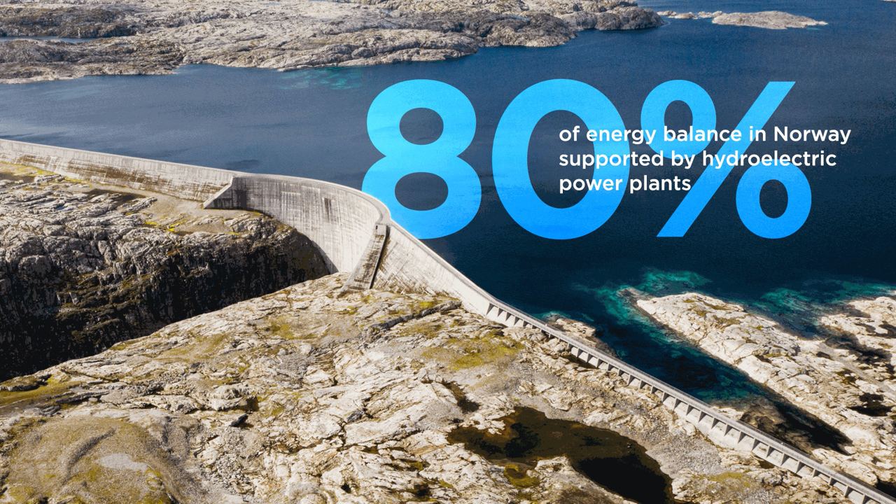 Знаходимо гарну світлину норвезької ГЕС. Блакитним, ми ж про воду, та дуже великим кеглем пишемо 80%. І на останок додаємо білий супровідний текст.