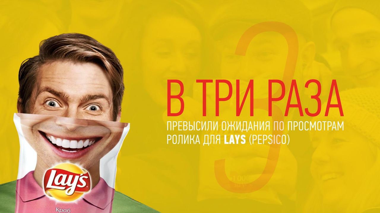 Тому я взяв ключовий віжуал тієї рекламної кампанії чипсів Лейс — обличчя людей, що наполовину прикриваються посмішкою на пачці снеків. Жовтий колір вже не пам’ятаю чому) Та додав великий напис «В ТРИ РАЗИ», щоб воно одразу впадало у вічі.
