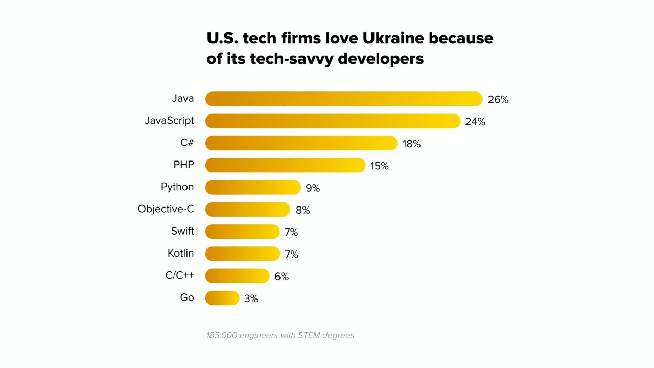 Візуалізація даних щодо техничних навичок українськіх девелоперів. Все це було надіслано у форматі нудного та непрезентабельного екселю, тому мені потрібно було це показати більш якісно.