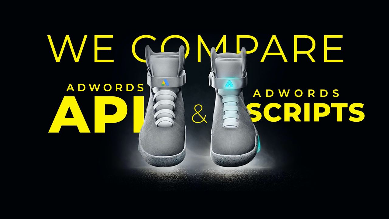 Слайд з презентації у стилістиці «Назад до майбутнього». Тут мова йде про порівняння Adwords API та Scripts — два інструменти. Через це я знайшов світлину з двома кросівками з цієї трилогії та розмістив навколо заголовок та підписи. Чорний фон з жовтим текстом забеспечує дуже файний контраст та круто виглядає.