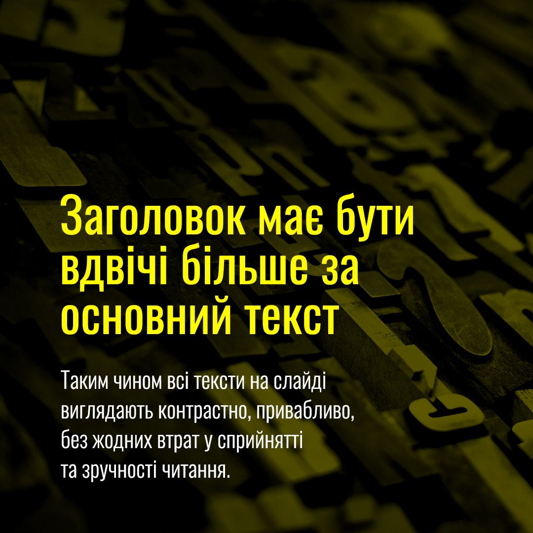 Тут діє принцип ієрархії: чим важливіша інформація, тим більшим кеглем вона набирається. Завдання заголовка – привернути увагу до повідомлення, тож він має бути найпомітнішим. А основний текст, набраний вдвічі меншим кеглем (розмір шрифта), виглядає гармонійно та легко сприймається.