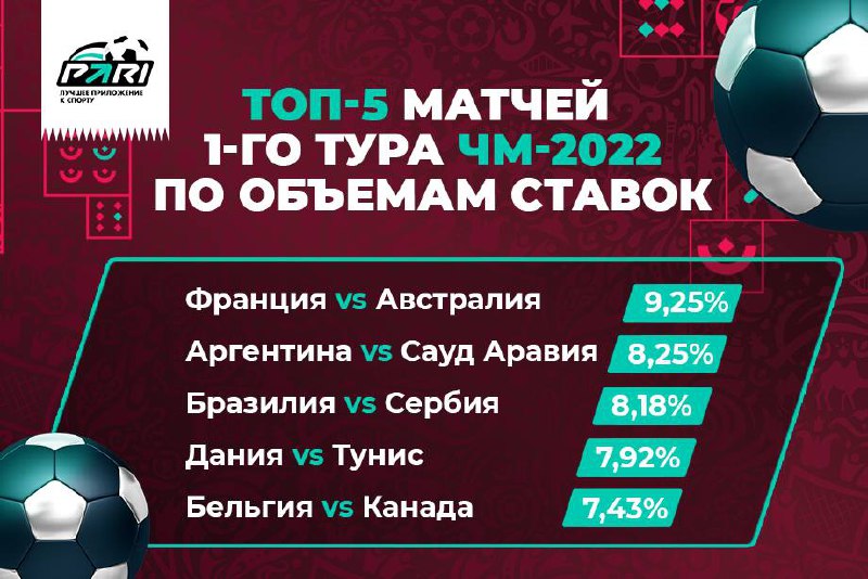 А больше всего ставок было сделано на игру Франция — Австралия (9,25% от общего числа ставок на первый круг). В топ-3 также игры Аргентина — Саудовская Аравия (8,25%) и Бразилия — Сербия (8,18%).