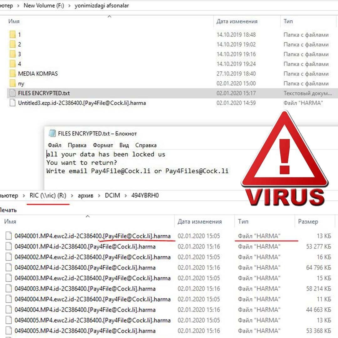 Mahalla xotinlaridan eshitishimcha, yangi virus chiqibdimish. U xotiraga o'rnashib oladida papka va ichidagi fayllarni shifrlab qo'yadi, kengaytmasi esa .harma . Ma'lumotni tiklamoqchi bo'lsangiz, bir xitoylikka 3000$ berasiz va u sizga shifrlangan kodni jo'natadi. Toshkentni manaman degan hakerlari ham hech narsa qilolmabdi. Bu usta topolmaysiz degani.
