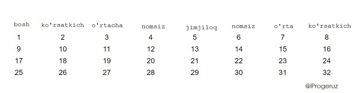Nega deysizmi? Sikl asosi 8, ya'ni har bir barmoqga to'g'ri keluvchi son 8 taga ko'payadi. 1000 ni 8 ga bo'lsak qoldiq 0 ga teng. Demak shunday barmoqni topishimiz kerakki, har bir aylanib kelganda, o'sha son 8 ga qoldiqsiz bo'linishi kerak. Ko'rsatkichga qarang. Barcha son 8 ga bo'linadi.