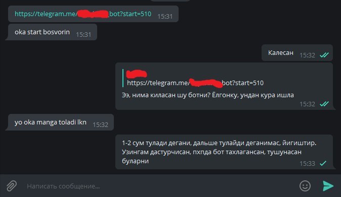 Bugun bilamiz, pul "to'lovchi" botlar juda juda ko'payib ketdi. Qaysiga kirsang, uncha kishiga yuboring, va pulni oling deydi. Aslida hammasi yolg'on! Qaysi ahmoq sizga shuuncha pul beradi deb o'ylaysiz? Yaqinda ko'rdim, nimamish, 28 ta referal yig'sangiz, 1048r. berisharmish. Menku, ishonmadim, ammo ishonganlar ham bo'ldi. Ko'pincha do'stlarimdan keladi shunaqa ssilkalar. "Start bos" deb yalinadi. Ha mayli deb bosib beraman. Ammo, natija yo'q.