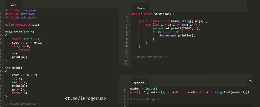 3 ta dasturlash tilida 1 dan N gacha sonlar kodi