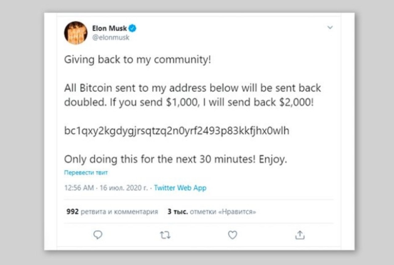 Куни кеча хакерлар Twitter'ни бузишди ва у ердаги ИТ-гигантларни номидан твит қолдиришди. Унда айтилишича, агар шу биткоин ҳамёнга шунча пул ўтказсангиз, сизга икки баравар қилиб қайтаришар экан. Ушбу "Aҳмадбой тактика" си иш берди ва улар бир кечани ўзида 12 BTC ($100к+) тўплашди.