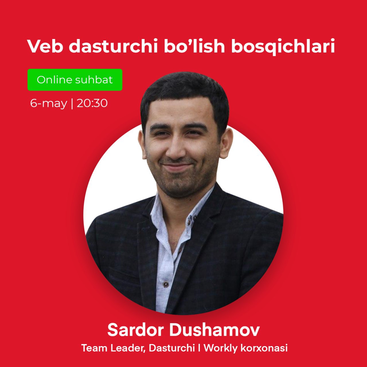 🔴 6-may kuni 20:30da Workly korxonasi Team Leaderi, Progress Academyda Backend veb dasturlash o'qituvchisi, dasturchi Sardor Dushamov bilan online suhbatni tomosha qiling!