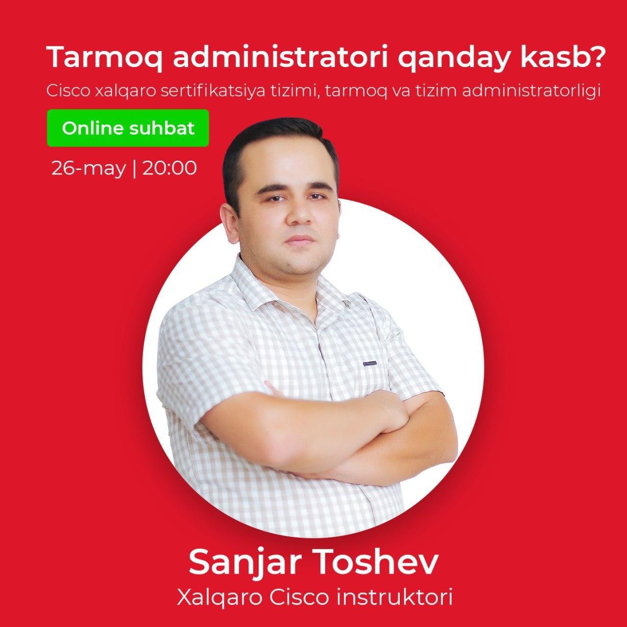 Galdagi suhbatimiz 26-may kuni 20:00da Xalqaro Cisco instruktori, Hindistonda tahsil olgan mutaxassis Sanjar Toshev bilan bo'lib o'tadi!