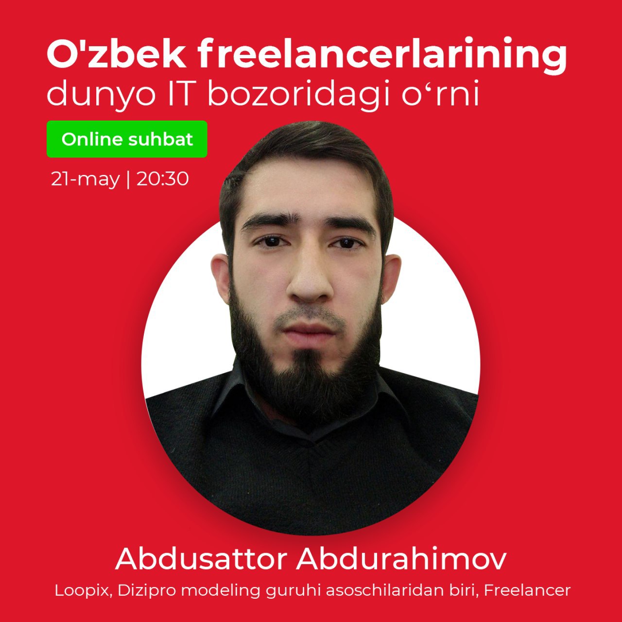🔴 21-may kuni 20:30da Loopix guruhi yetakchilaridan, "Dizipro" 3D modeling guruhi asoschilaridan biri, freelancer Abdusattor Abdurahimov bilan online suhbatni tomosha qiling!