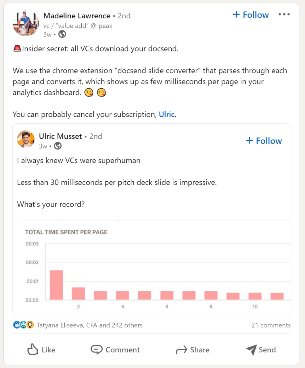 Но у вас все больше и больше возникают такие же проблемы, как у фаундера в приложенном скриншоте. 30 миллисекунд на слайд при просмотре дэка – это сверхлюди и как они это делают?