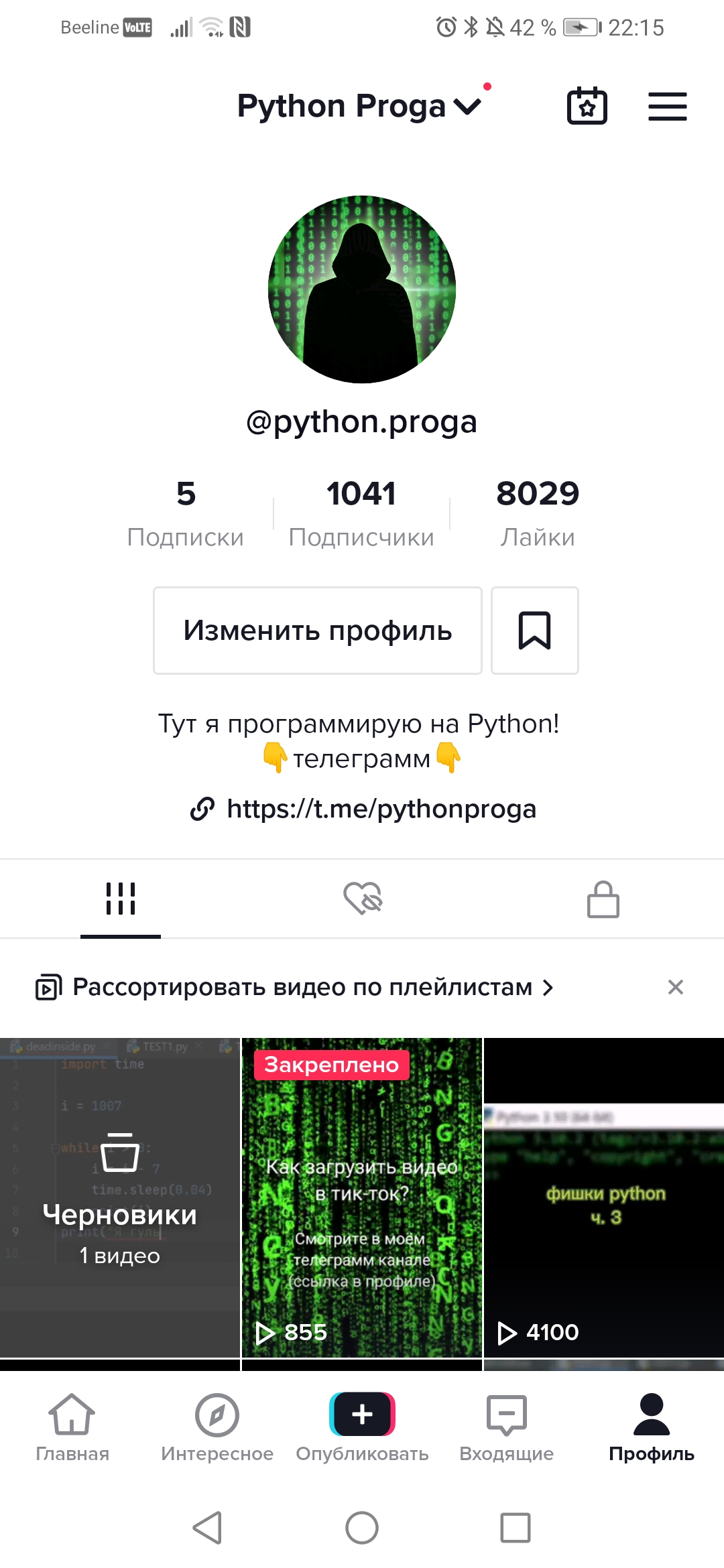 Как многие уже заметили, я добавил новую функцию в свой бот. Благодаря ней, вы можете писать мне различные сообщения. Мне уже написало около 4 человек, но я случайно стёр все записи. Но отныне я буду сохранять всё, что мне через него пишут, и периодично записывать видео в тик-токе, где я буду отвечать на эти сообщения. Если, что вот сам бот: @pythonprogabot