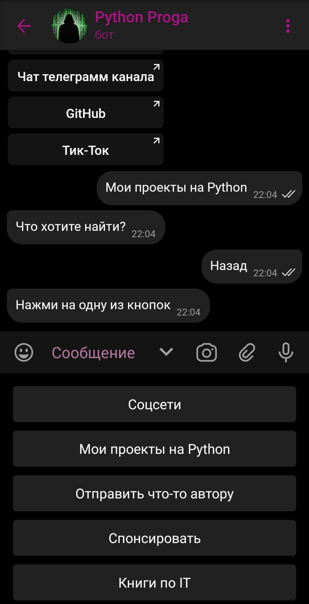 Как многие уже заметили, я добавил новую функцию в свой бот. Благодаря ней, вы можете писать мне различные сообщения. Мне уже написало около 4 человек, но я случайно стёр все записи. Но отныне я буду сохранять всё, что мне через него пишут, и периодично записывать видео в тик-токе, где я буду отвечать на эти сообщения. Если, что вот сам бот: @pythonprogabot