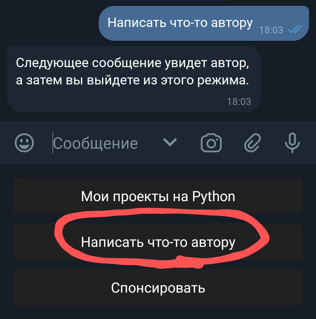 Следующий раздел, это "Отправить что-то автору". В нём вы можете написать мне сообщение, отправить фото, видео или документ с кодом. На все эти сообщения я потом отвечаю.