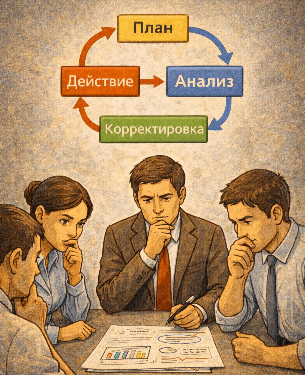 Напомню, что Цикл Деминга состоит из стандартных действий: План - Действие - Анализ - Корректировка.