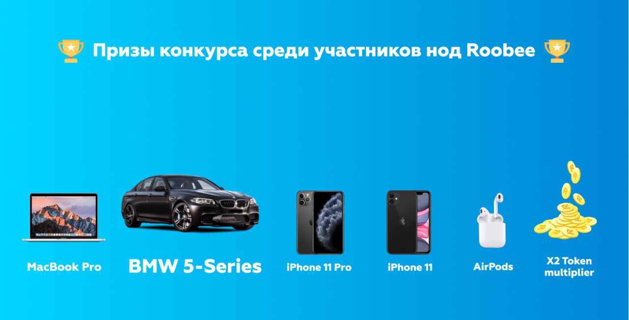 Для ВСЕХ участников программы нод предусмотрен масштабный конкурс, где будет возможность выиграть: BMW 5, MacBook Pro, iPhone 11, iPhone 11 Pro, множитель токенов ROOBEE и наушники AirPods