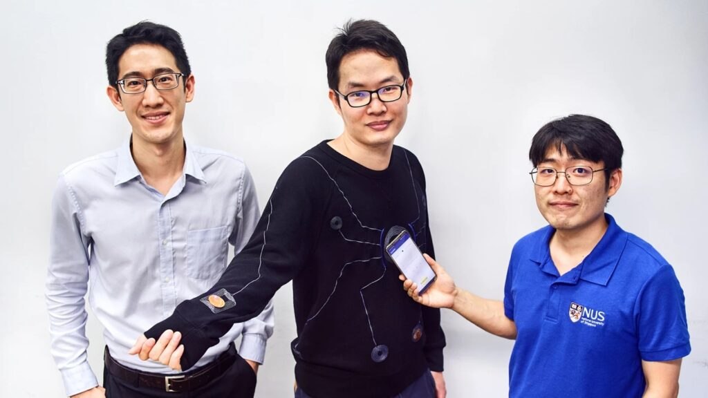 Инженеры из национального университета Сингапура (NUS) под руководством Джона Хо разработана умная одежда без батареек. Она оснащена несколькими датчиками, подключенных между собой структурой веб-нитей. Нити передают электромагнитные сигналы от смартфона к шести датчикам.