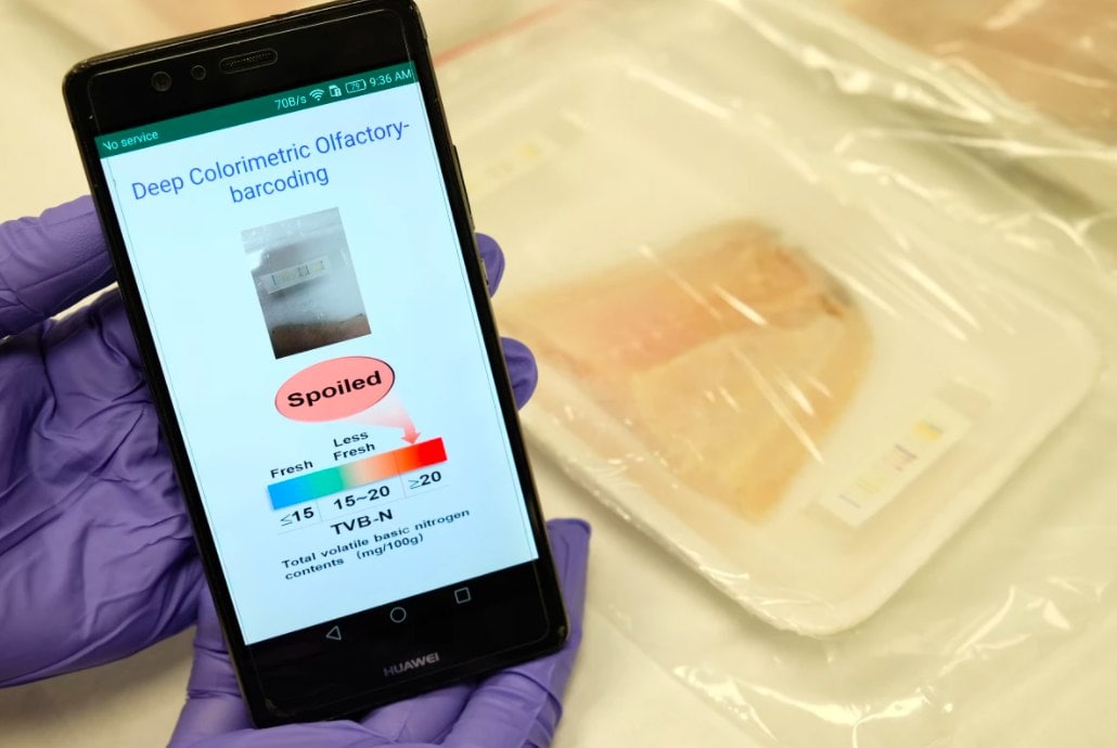 На упаковку со стейком наносят полоски из хитозана и целлюлозы с чувствительными красителями. При разложении мясо выделяет газы, красители реагируют на них и меняют цвет. Приложение анализирует узоры на полосках и делает выводы, насколько этот кусок свежий.