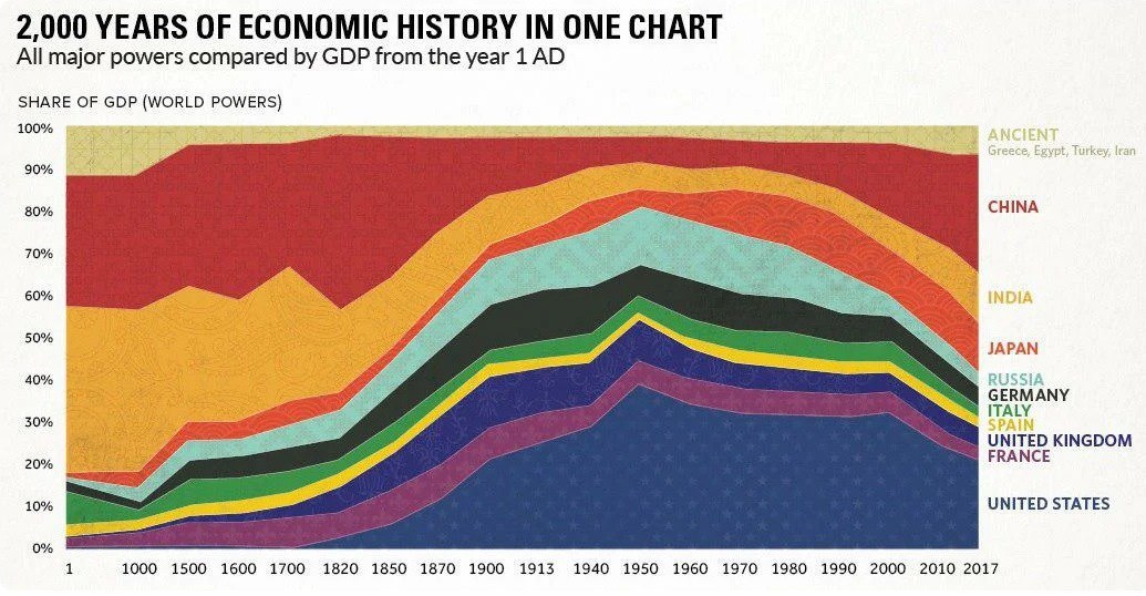 Натолкнулся на любопытную экономическую статистику, говорящую о том, что в вертикальном экономическом подъёме в Китае и Индии нет ничего удивительного: они просто возвращают долю мирового продукта, которая у них была ранее. Хотя в то, что возьмут обратно 70% мирового ВВП верится с трудом.
