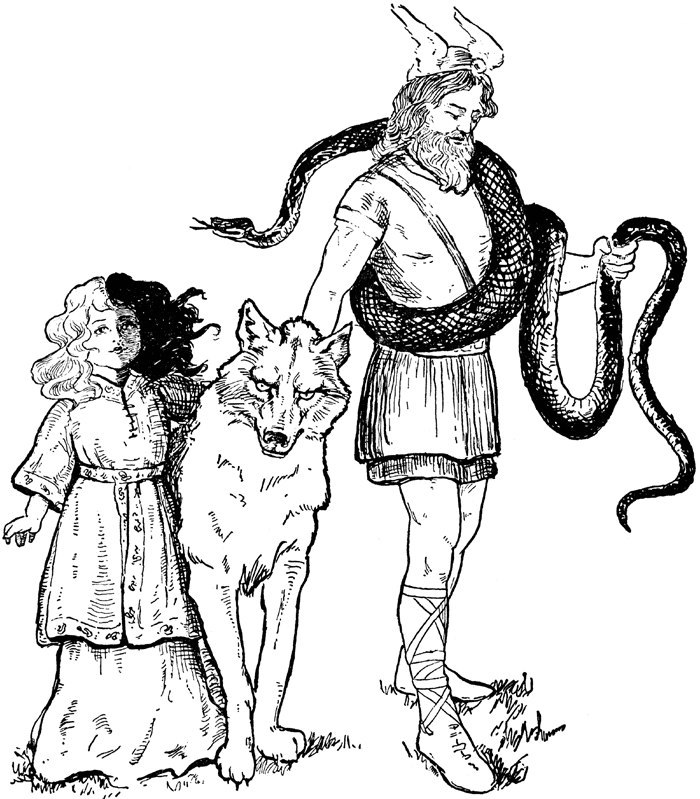 Ниже изображены Локи и его дети: Хель, Фенрир и Ёрмунганд.