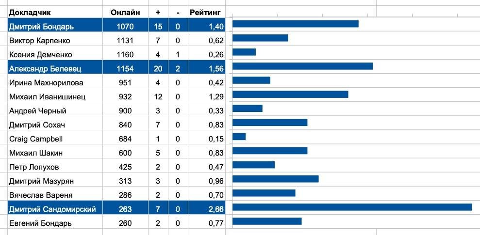 Сергей Кокшаров подсчитал результаты голосования за доклады, учел количество онлайн-слушателей и предоставил рейтинг наиболее популярных выступлений конференции NaZapad 15.