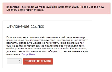 Появилось оповещение в Search Console старой версии Google Disavow Links Tool о точной дате прекращения работы инструмента - 19 января 2021.