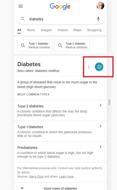 Замечено тестирование новой функции Google для получения предупреждений по отдельным YMYL-запросам. Видимо, теперь можно получать новости и другие обновления по запросам медицинской тематики из панели знаний Google.