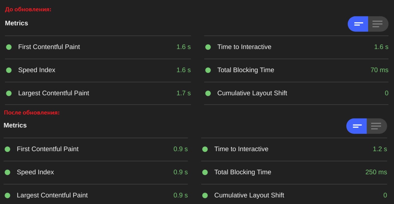 На прикрепленном скрине тест с значительно улучшенными показателями Core Web Vitals на примере простой страницы с небольшим количеством блоков. У страниц с более сложной структурой эти улучшения будут еще более выраженными.